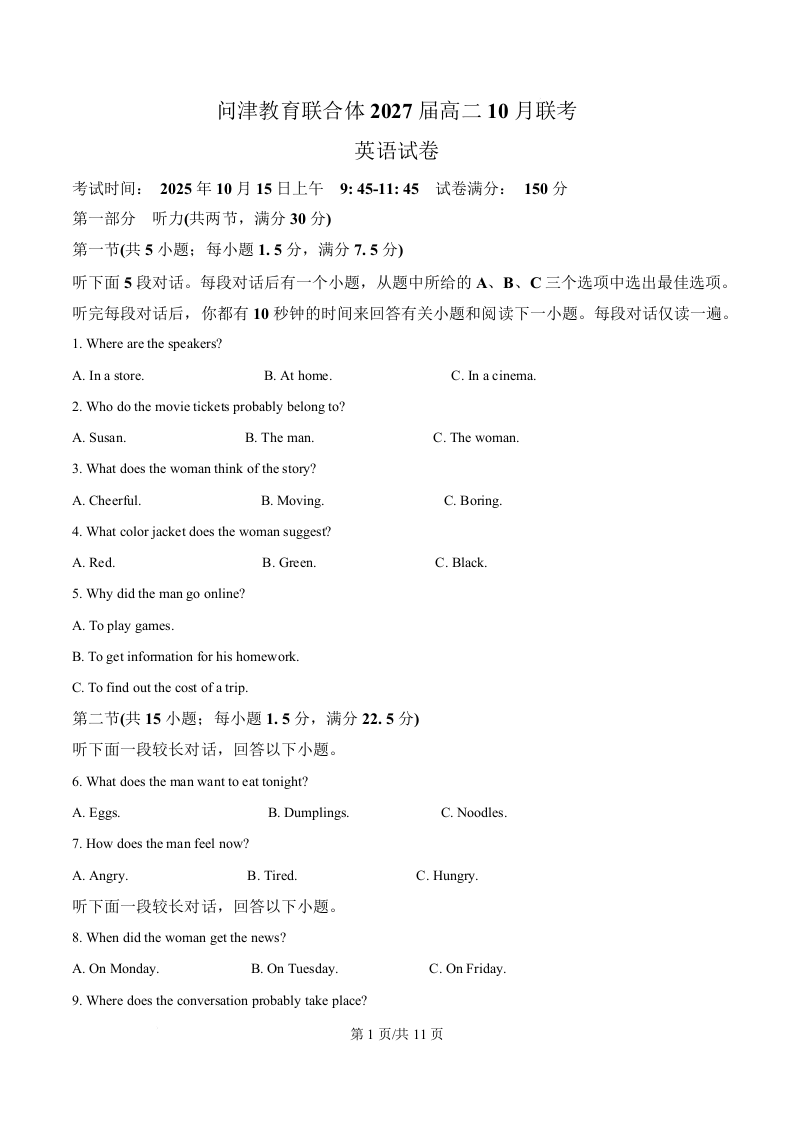 高二英语(原卷版)--湖北省武汉市问津联盟2025-2026学年高二上学期10月联考