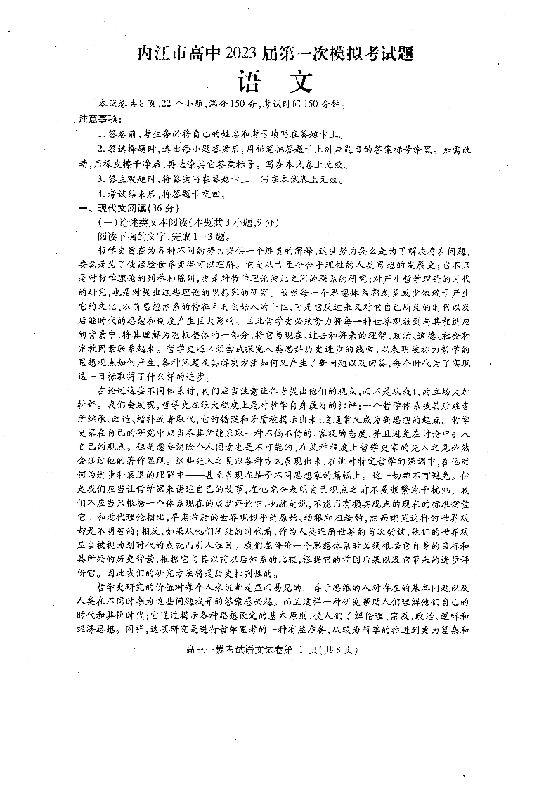 高三语文--四川省内江市2023届高三第一次模拟考试