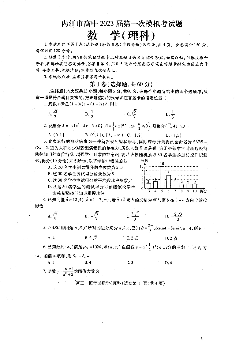 高三理数--四川省内江市2023届高三第一次模拟考试