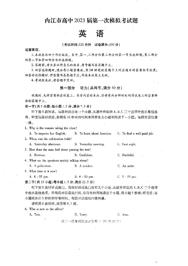 高三英语--四川省内江市2023届高三第一次模拟考试