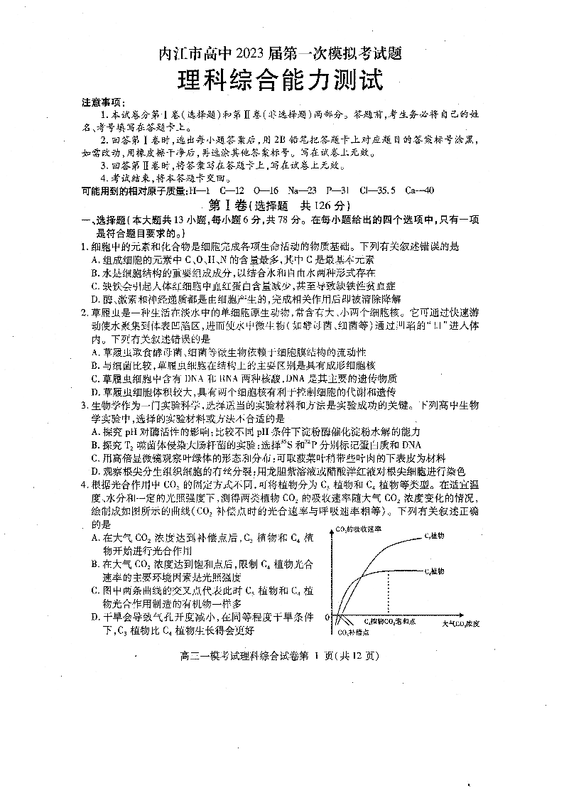 高三理综--四川省内江市2023届高三第一次模拟考试