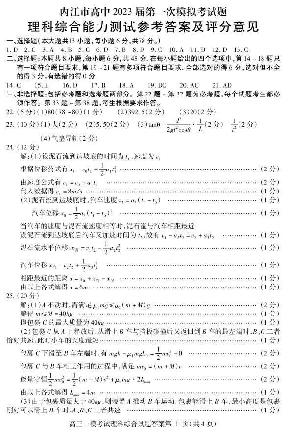 高三理综答案--四川省内江市2023届高三第一次模拟考试
