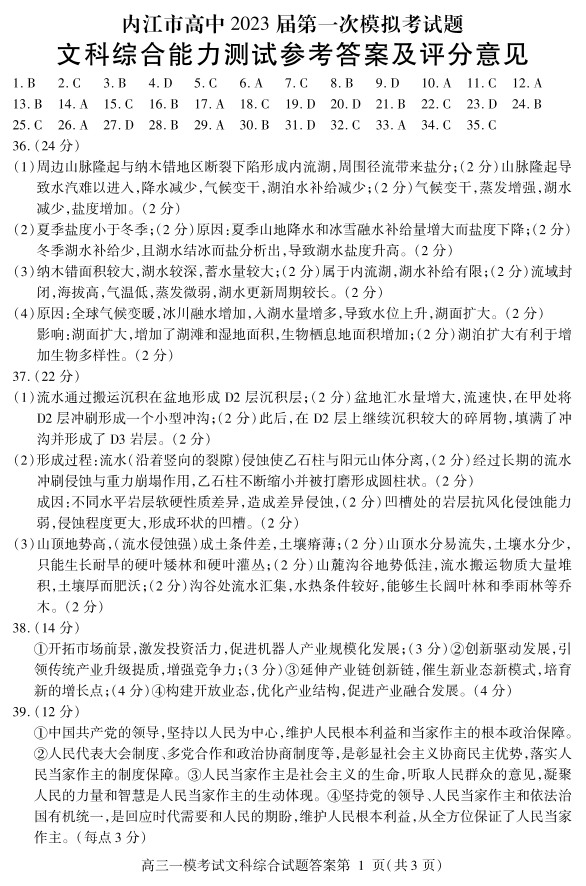 高三文综答案--四川省内江市2023届高三第一次模拟考试
