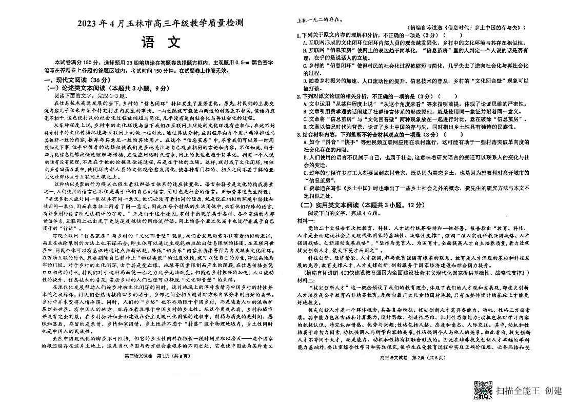 高三语文--广西壮族自治区玉林市2023届高三下学期三模