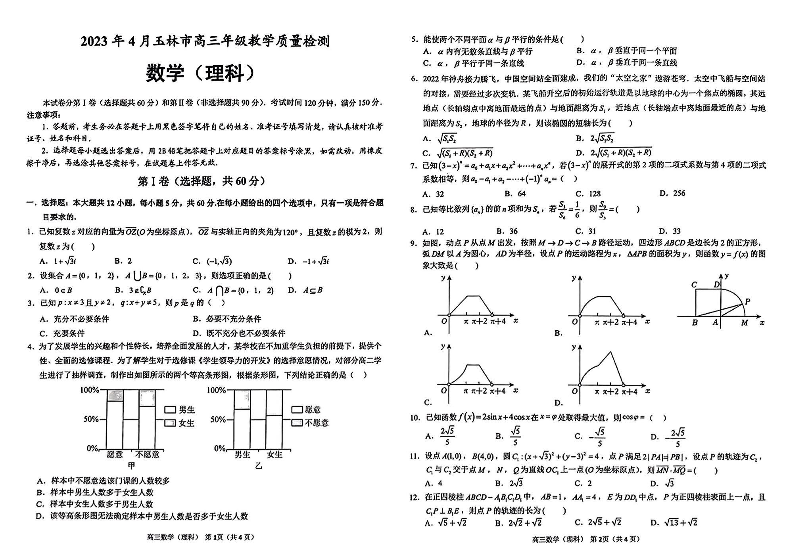 高三理数--广西壮族自治区玉林市2023届高三下学期三模