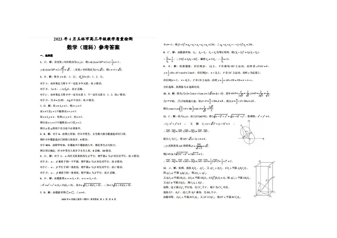 高三理数答案--广西壮族自治区玉林市2023届高三下学期三模