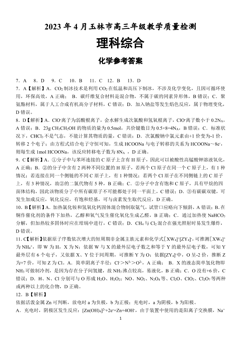 高三理综化学答案--广西壮族自治区玉林市2023届高三下学期三模