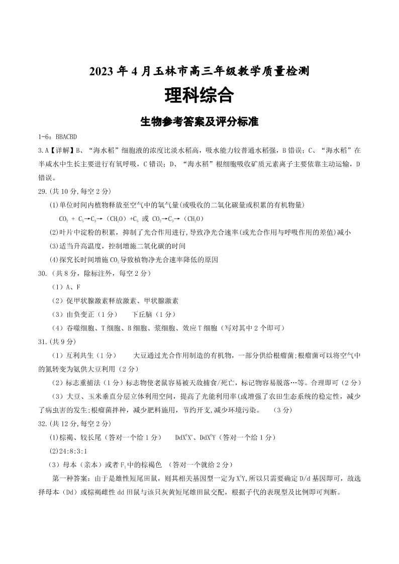 高三理综生物答案--广西壮族自治区玉林市2023届高三下学期三模