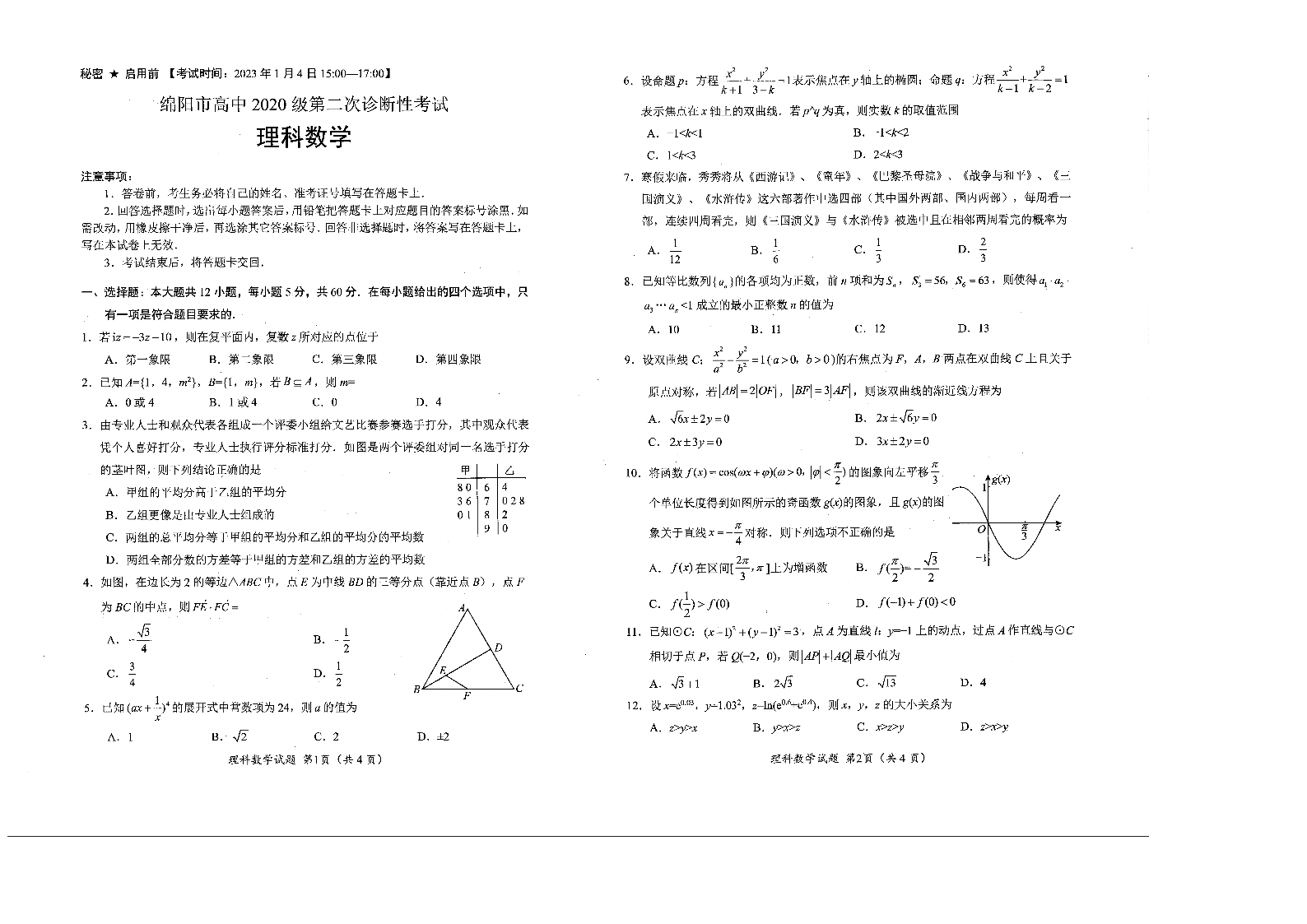 高三理科数学--四川省绵阳市2023届高三第二次诊断性考试