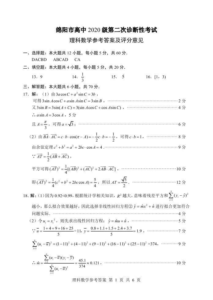 高三理科数学答案--四川省绵阳市2023届高三第二次诊断性考试