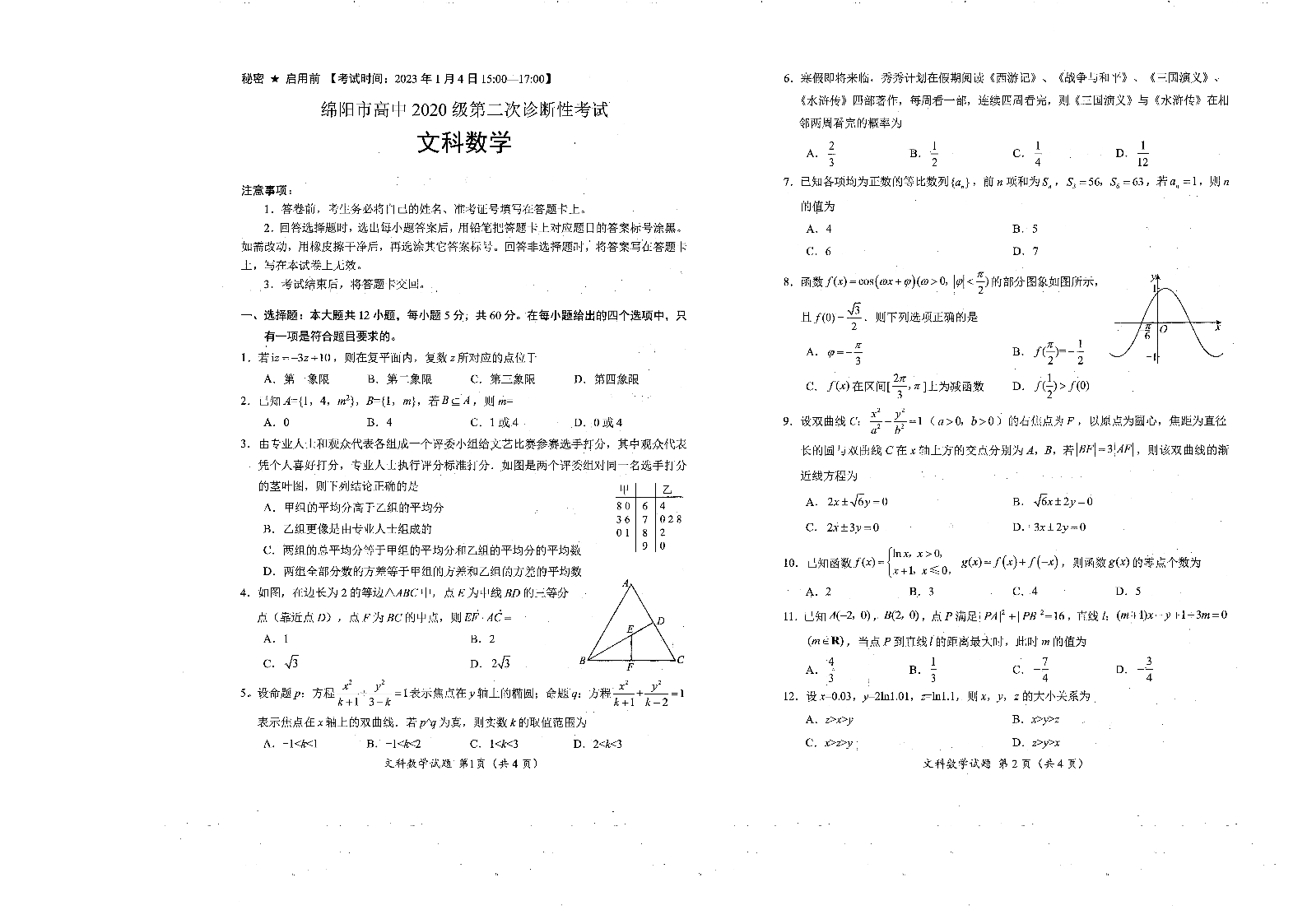 高三文科数学--四川省绵阳市2023届高三第二次诊断性考试