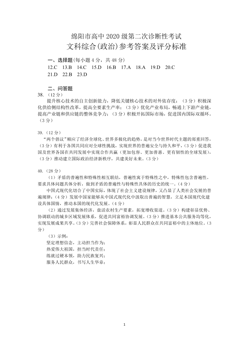高三文科综合答案--四川省绵阳市2023届高三第二次诊断性考试