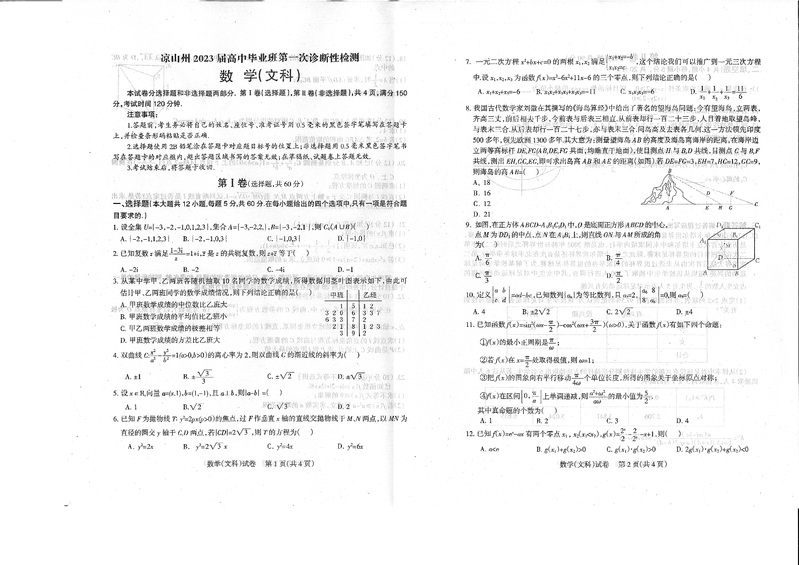 高三文数--四川省凉山州高中毕业班第一次诊断性检测