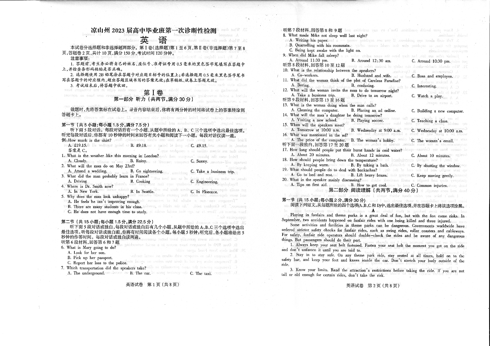 高三英语--四川省凉山州高中毕业班第一次诊断性检测