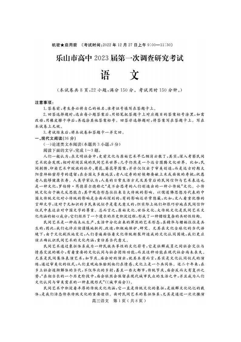 高三语文--四川省乐山市2023届高三第一次调查研究考试