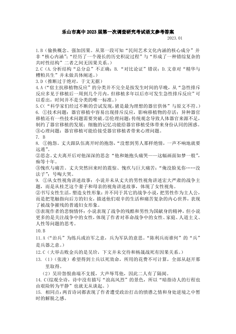 高三语文答案--四川省乐山市2023届高三第一次调查研究考试
