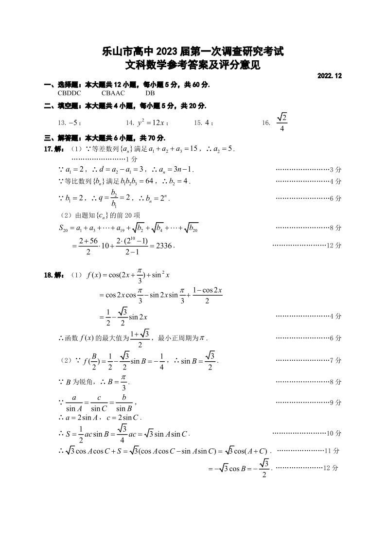 高三文数答案--四川省乐山市2023届高三第一次调查研究考试