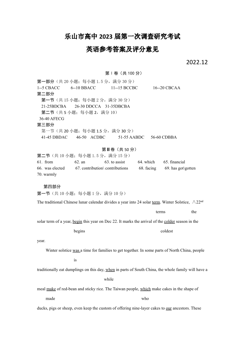 高三英语答案--四川省乐山市2023届高三第一次调查研究考试