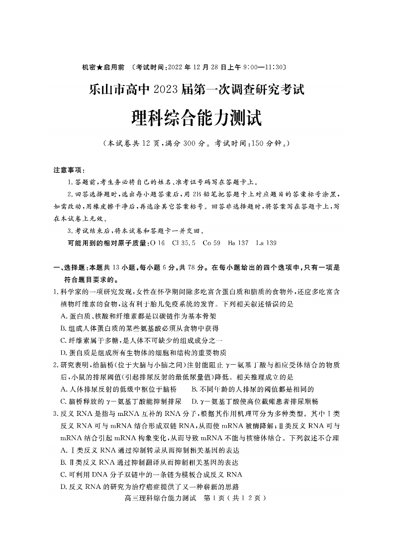 高三理综--四川省乐山市2023届高三第一次调查研究考试