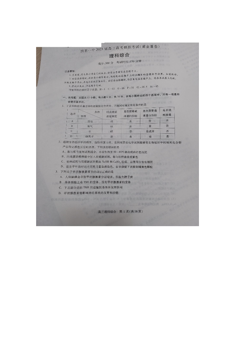 高三理综--贵州省凯里市第一中学2023届高三三模