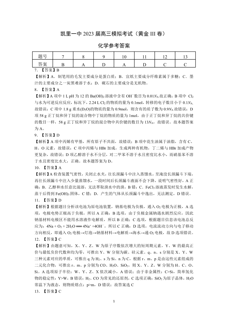 高三理综化学答案--贵州省凯里市第一中学2023届高三三模