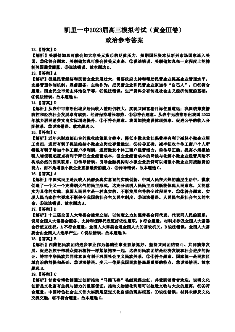 高三文综政治答案--贵州省凯里市第一中学2023届高三三模