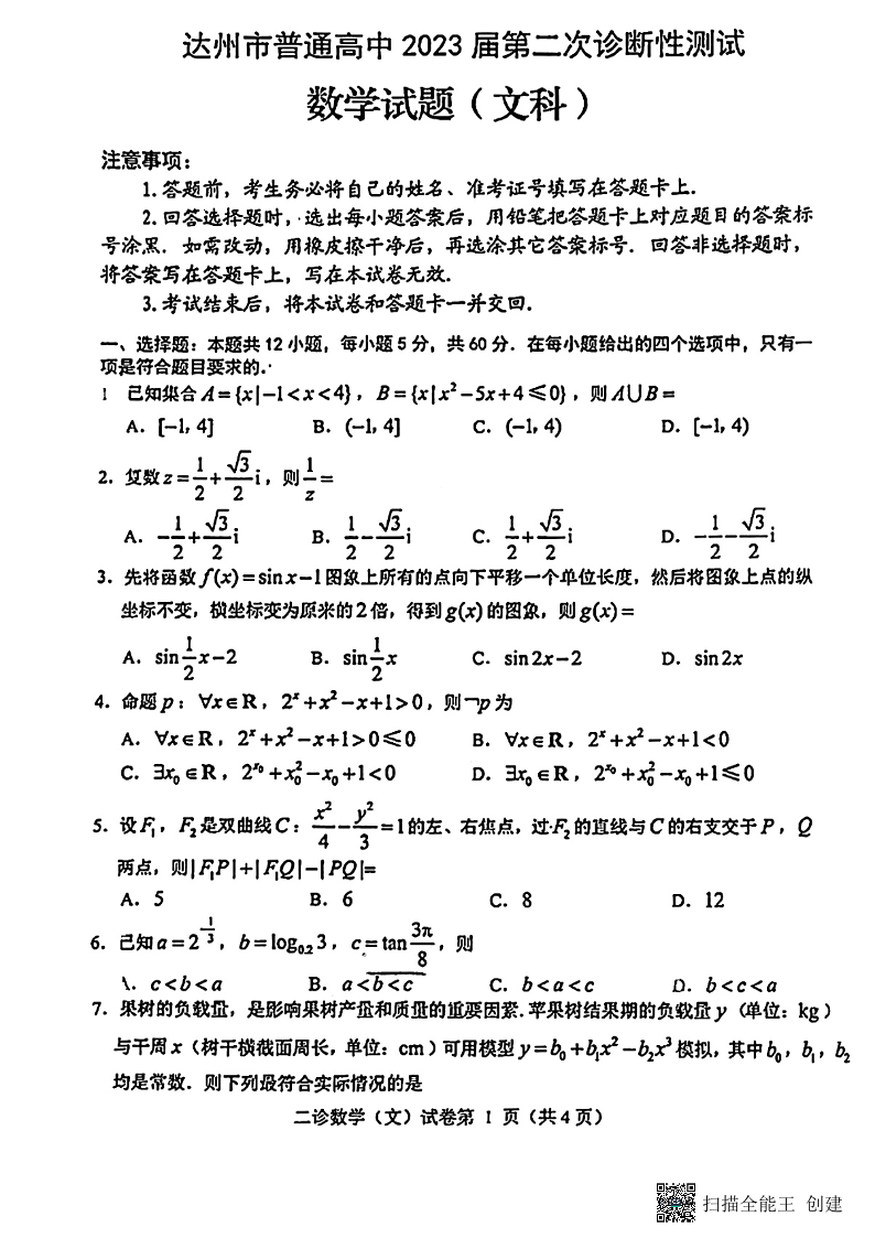 高三文数--四川省达州市2023届高三下学期第二次诊断性测试