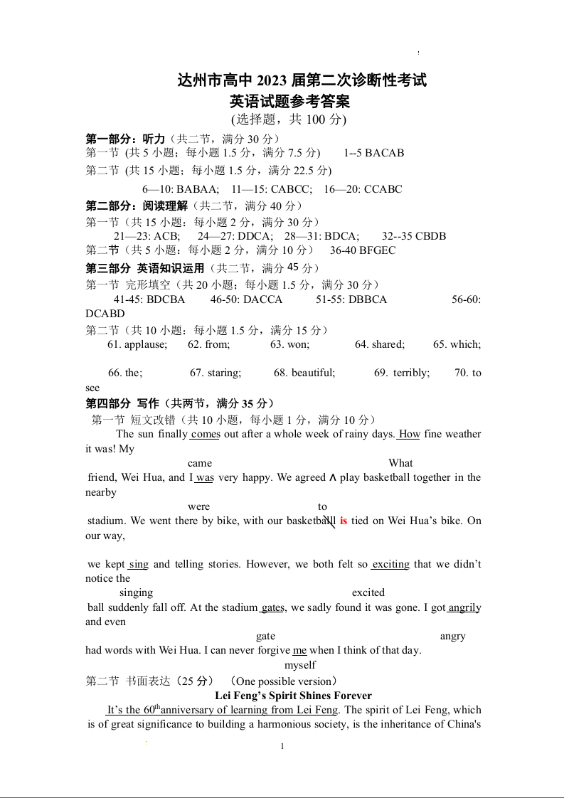 高三英语答案--四川省达州市2023届高三下学期第二次诊断性测试
