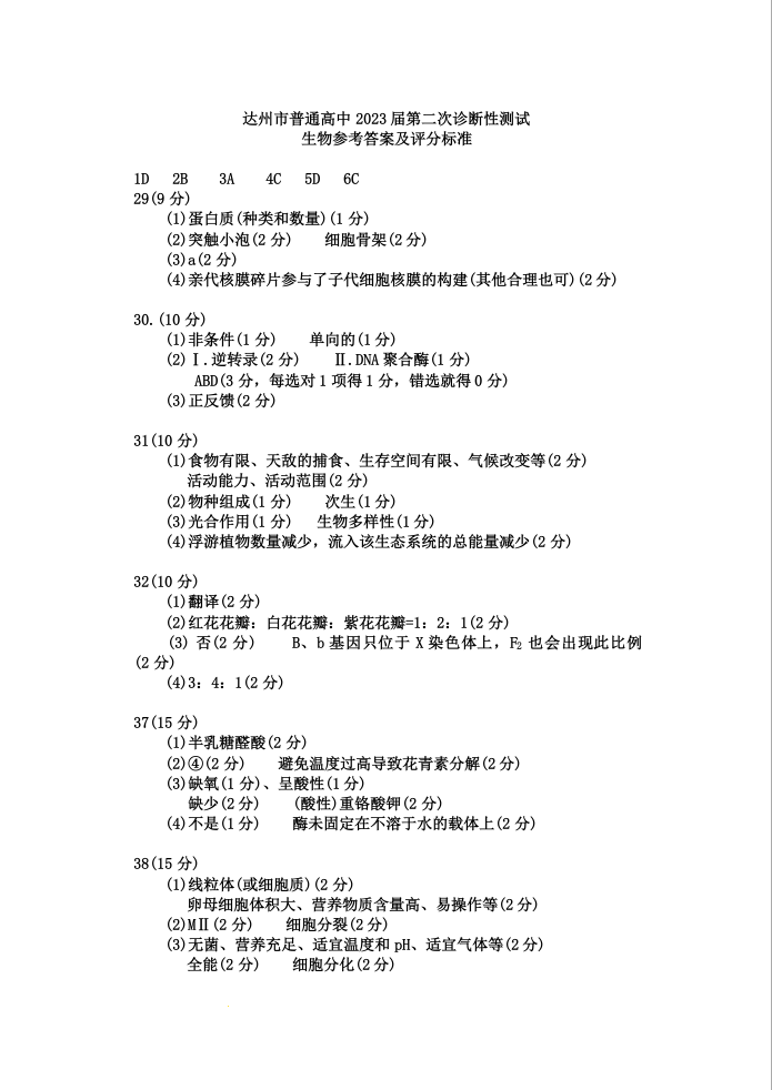 高三理综生物答案--四川省达州市2023届高三下学期第二次诊断性测试