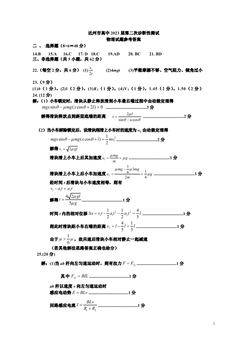 高三理综物理答案--四川省达州市2023届高三下学期第二次诊断性测试