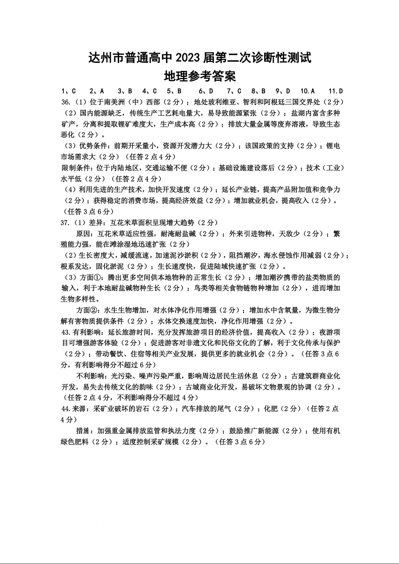 高三文综地理答案--四川省达州市2023届高三下学期第二次诊断性测试