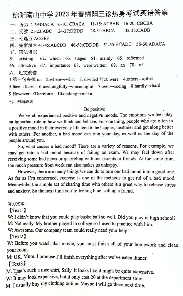 高三英语答案--四川省绵阳南山中学2023届高三三诊热身考试