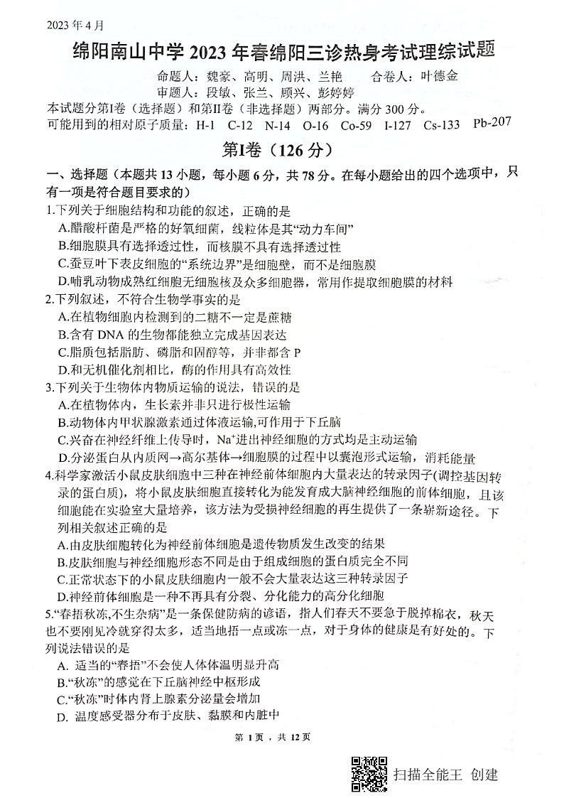高三理综+答案--四川省绵阳南山中学2023届高三三诊热身考试