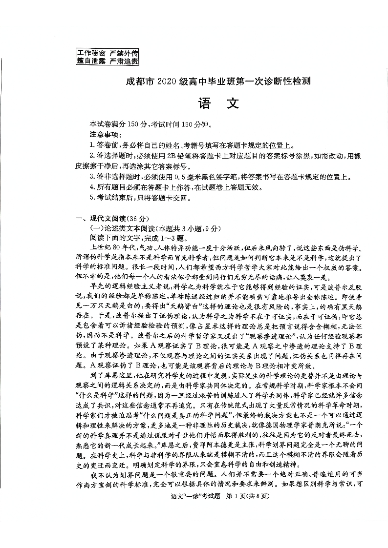 高三语文--四川成都市2020级高中毕业班第一次诊断性检测