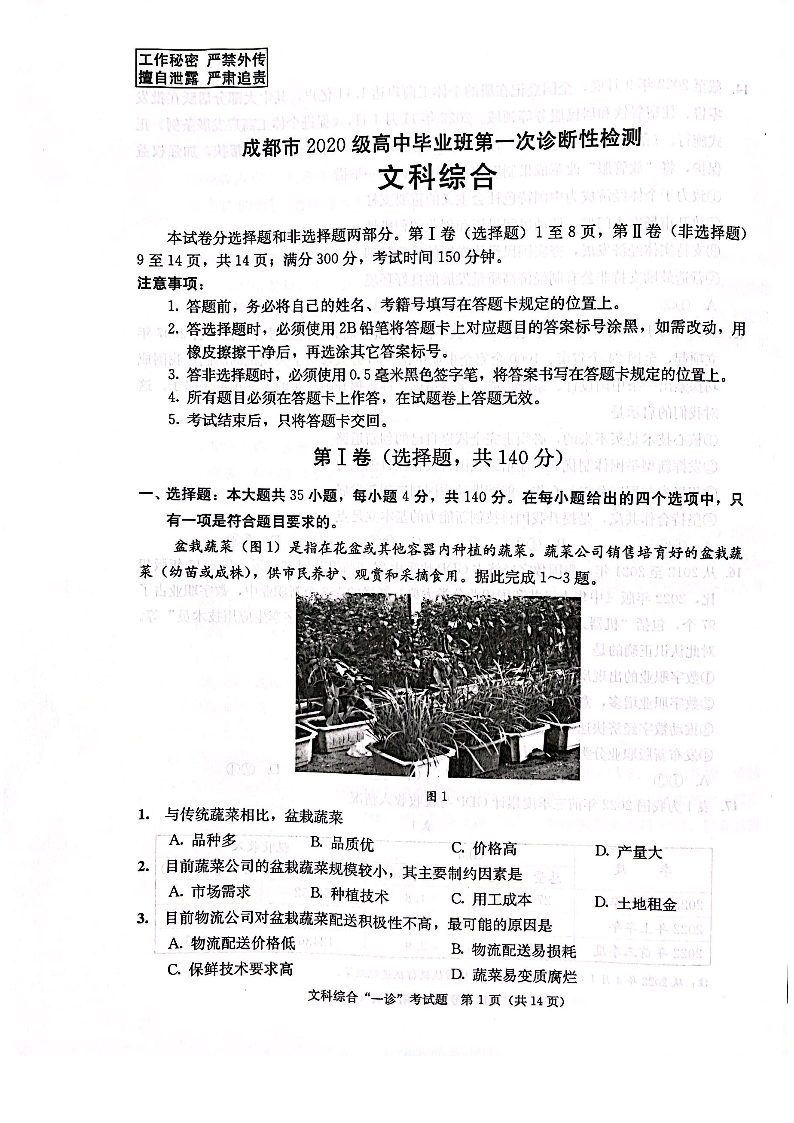 高三文综--四川成都市2020级高中毕业班第一次诊断性检测