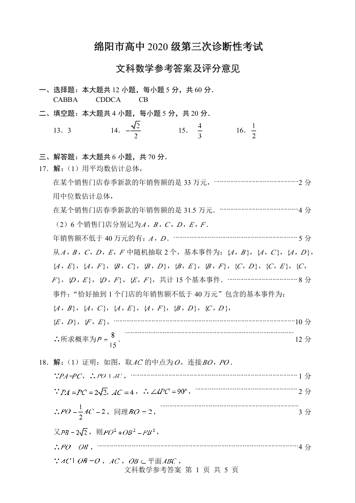 高三文数答案--四川省绵阳市2023届高三第三次诊断性考试