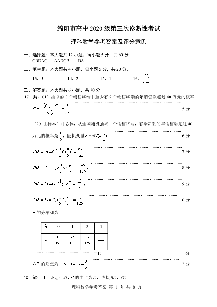 高三理数答案--四川省绵阳市2023届高三第三次诊断性考试