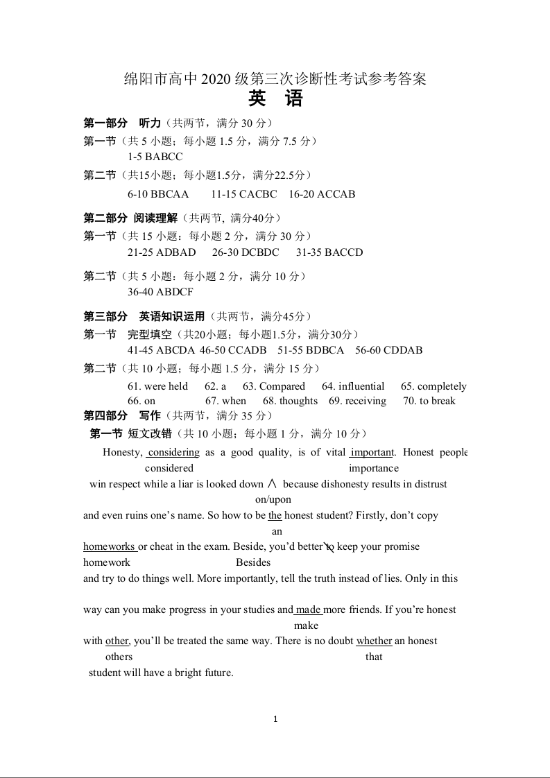 高三英语答案--四川省绵阳市2023届高三第三次诊断性考试