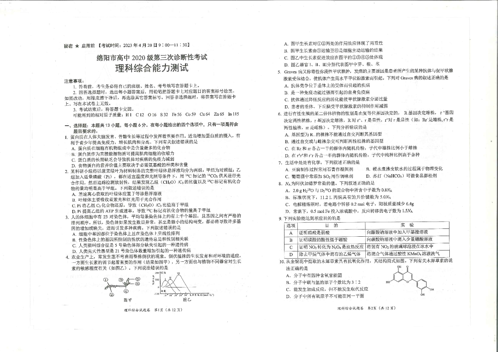 高三理综--四川省绵阳市2023届高三第三次诊断性考试