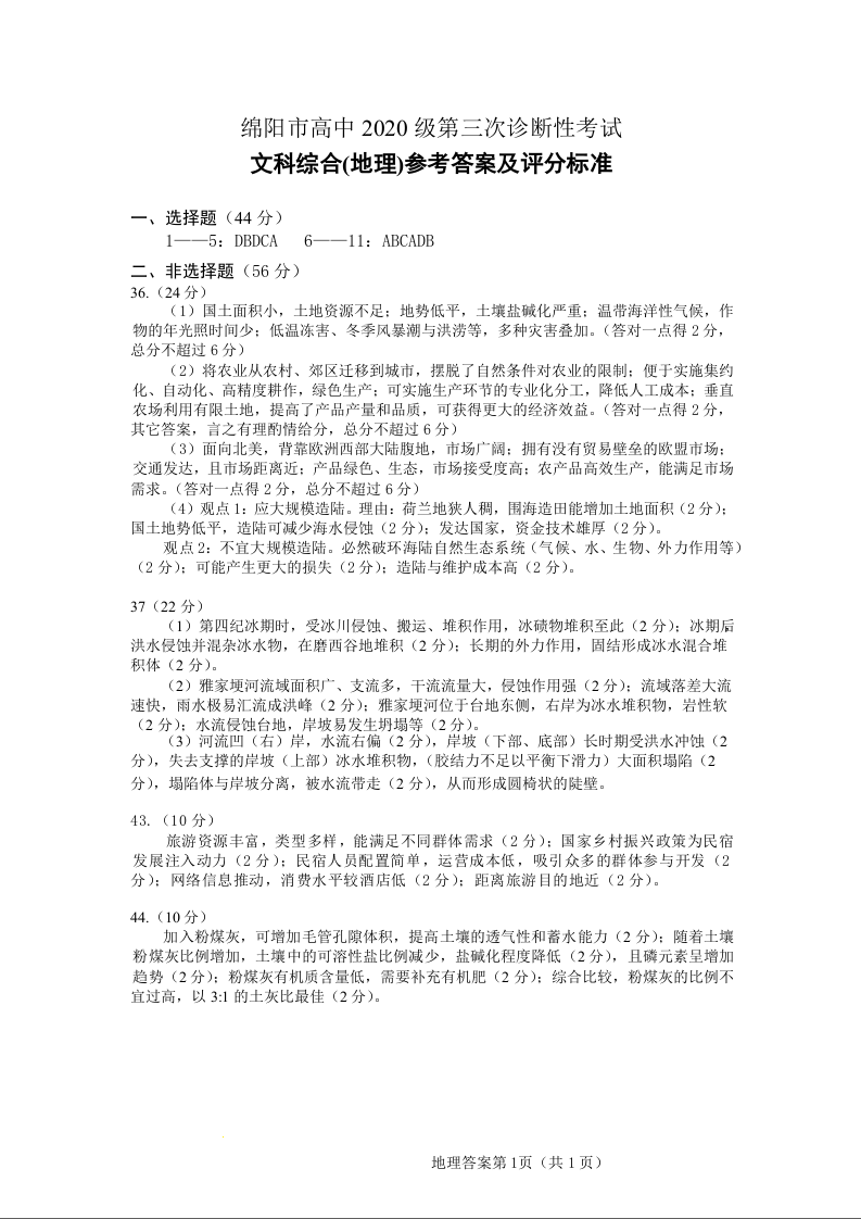 高三文综地理答案--四川省绵阳市2023届高三第三次诊断性考试