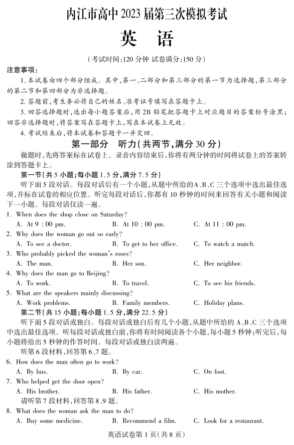 高三英语+答案--四川省内江市2023届高三下学期第三次模拟考试
