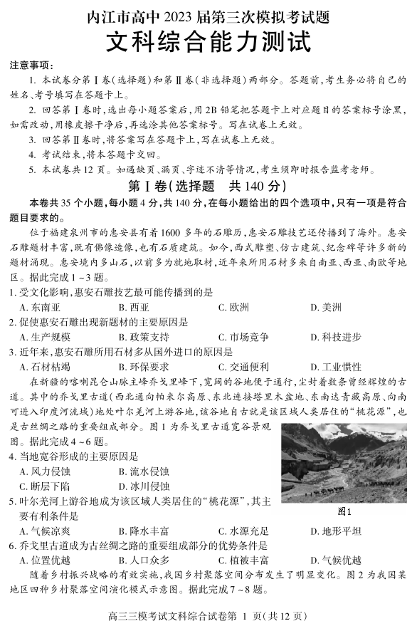 高三文综+答案--四川省内江市2023届高三下学期第三次模拟考试