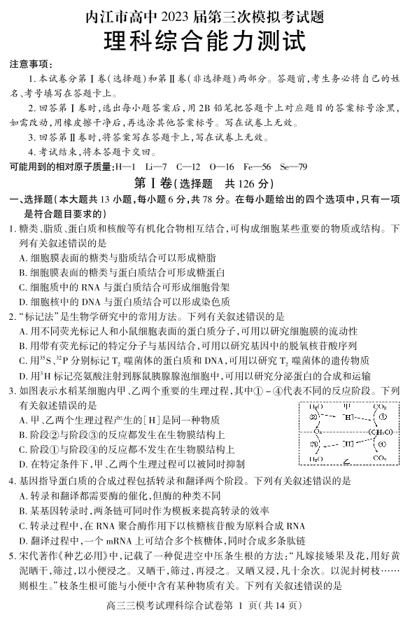 高三理综--四川省内江市2023届高三下学期第三次模拟考试