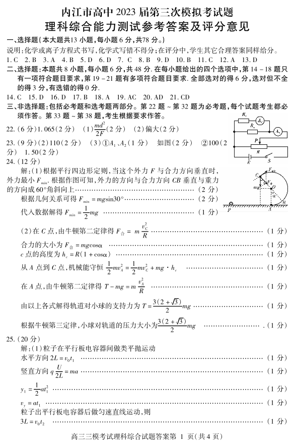高三理综答案--四川省内江市2023届高三下学期第三次模拟考试