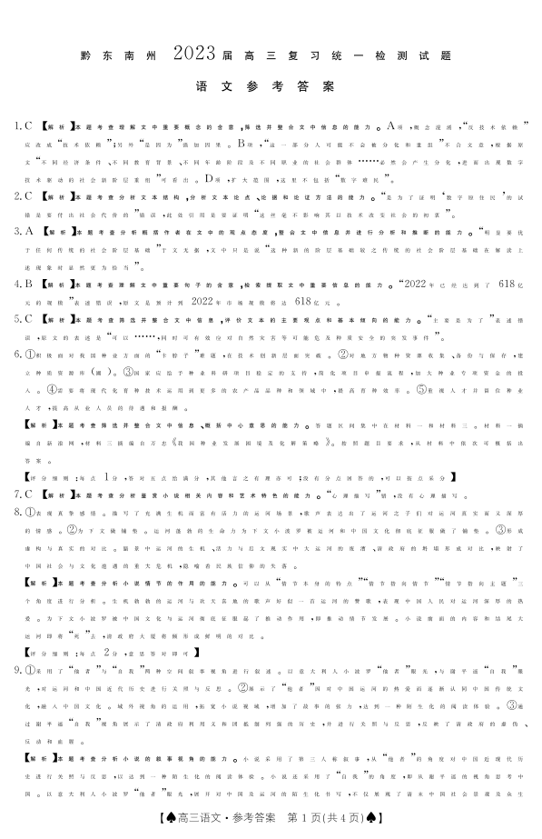 高三语文答案--贵州省黔东南州2023届高三上学期复习统一检测(期末)