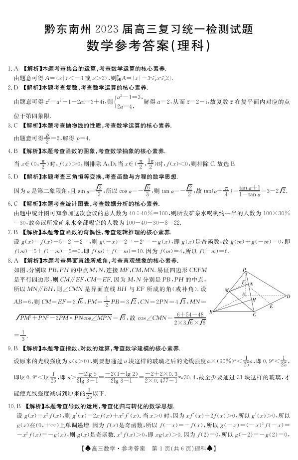 高三理科数学答案--贵州省黔东南州2023届高三上学期复习统一检测(期末)
