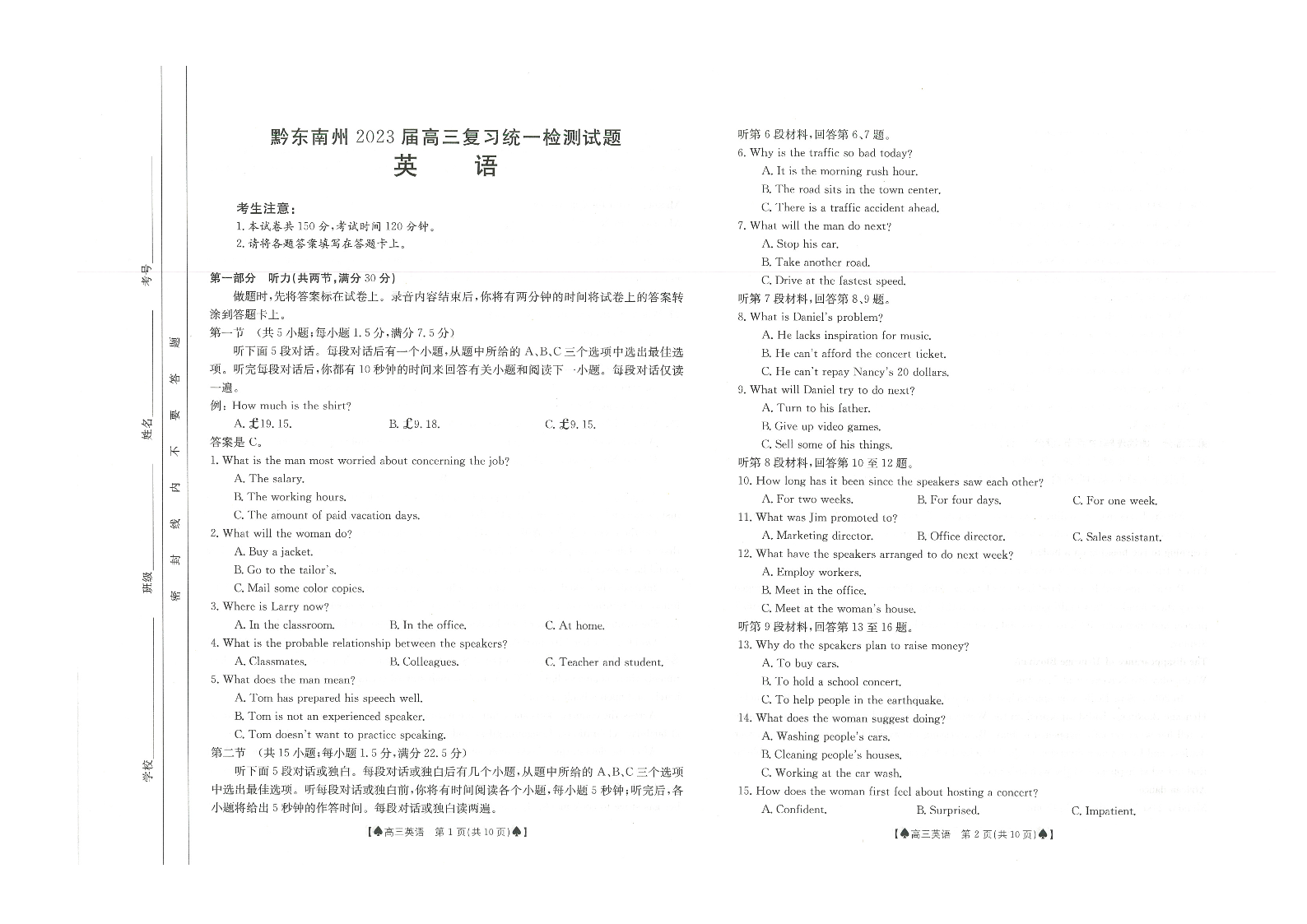 高三英语--贵州省黔东南州2023届高三上学期复习统一检测(期末)