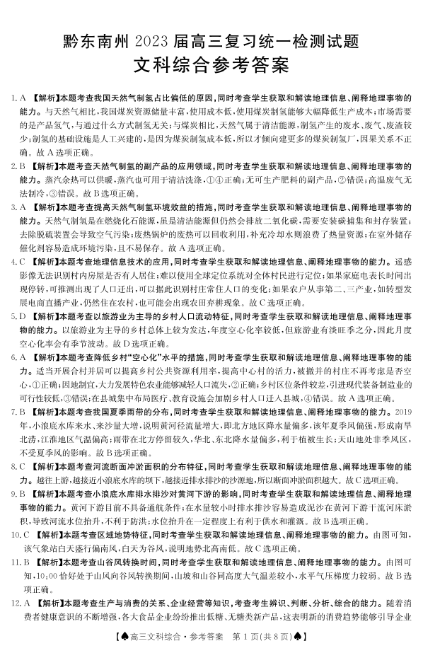 高三文科综合答案--贵州省黔东南州2023届高三上学期复习统一检测(期末)