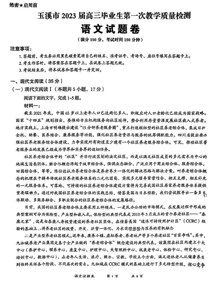 高三语文+答案--云南省玉溪市2023届高三毕业生第一次教学质量检测