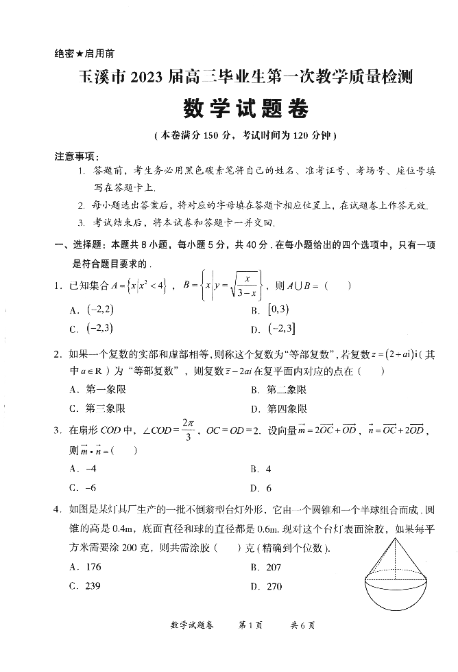 高三数学--云南省玉溪市2023届高三毕业生第一次教学质量检测